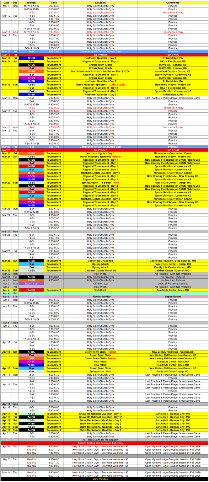 The Swarm is looking for 2-3 additional coaches – both head and assistants for next season. Volleyball knowledge and a passion for the game are essential. Open gyms will start in late April, followed by camps and tryouts. Contact us at swarmvolleyball@gmail.com or call 816-739-8107.