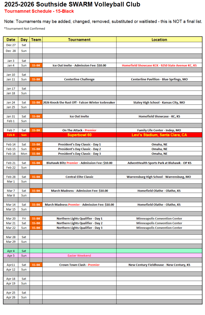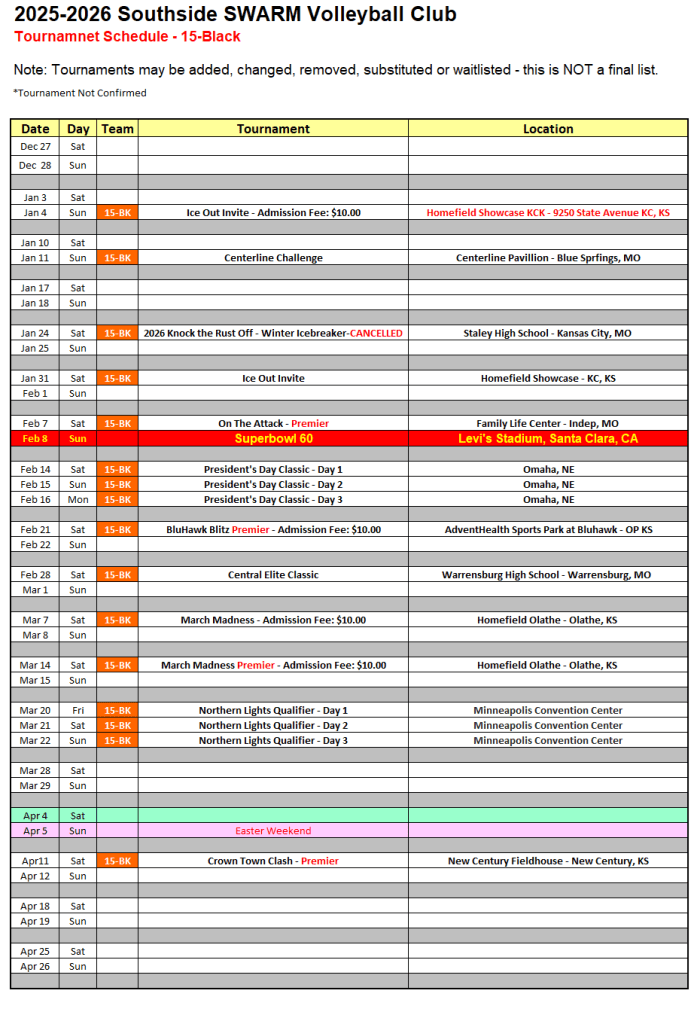 Cheryl Barnett | Coach Sara LaJaunie | Coach The Swarm is a competitive volleyball club. Your club fees pay for coaching, facilities, equipment, and uniforms. Tournament playing time is bonus and is at the sole digression of the coach. Stats Tracking Tournament Info Rules & Regulations Stats Tracking Serving & Attack Stats Tracking Form Tournament Info Tournament Officiating Duties ListTournament Food Facts – Coach James HartTournament Overview and Results ExplanationsTournament Pool Results SheetTournament Bracket Results SheetSuggested Items to Bring to a Tournament Rules & Regulations Indoor Officiating and Scoring Guidelines (USA Volleyball)Complete Indoor Rulebook (USA Volleyball)Abridged Indoor Rulebook (USA Volleyball)